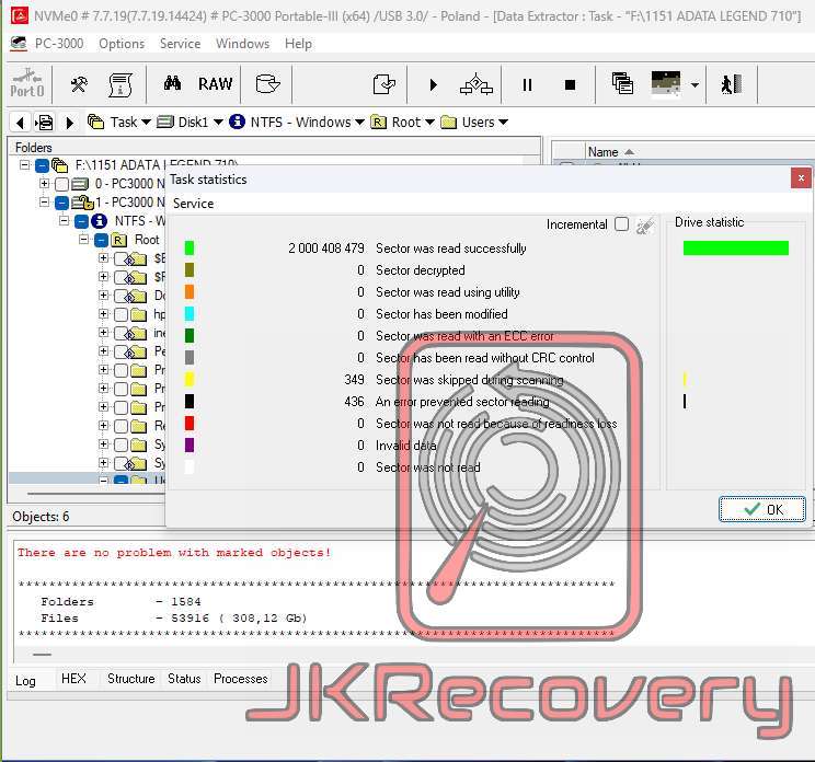 Proces zakończył się odzyskaniem 100% danych użytkownika.